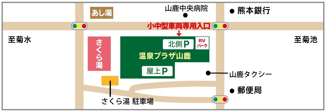 ※到着されましたら、下図の小中型車両入口(北側駐車場入口)よりスロープで 2階へ上がり、RV パーク専用スペース(緑枠内)に駐車後、お電話下さい。